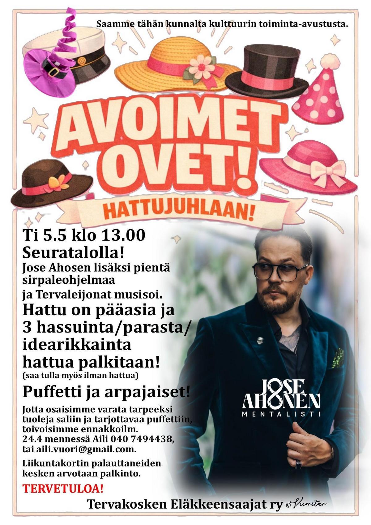 Tervakosken Eläkkeensaajat järjestää Hattujuhlan tiistaina 5.5.2026 alkaen klo 13:00 Seuratalolla. Ilmoittautukaa, jos menette paikalle.